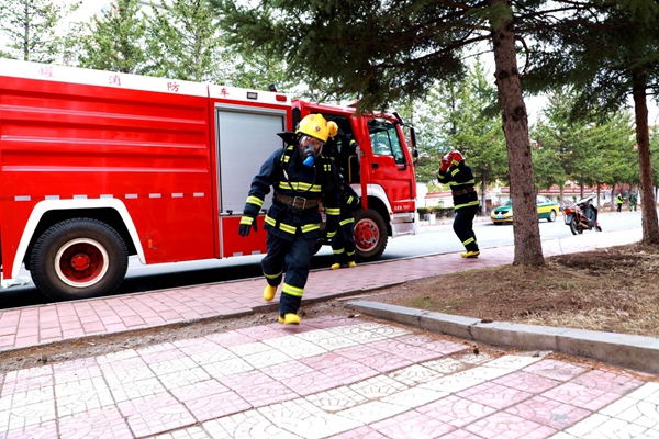 阿木爾林業(yè)局城鎮(zhèn)消防大隊(duì)?wèi)?zhàn)斗員迅速到達(dá)模擬火警點(diǎn),開(kāi)展救助行動(dòng)(王力 攝)