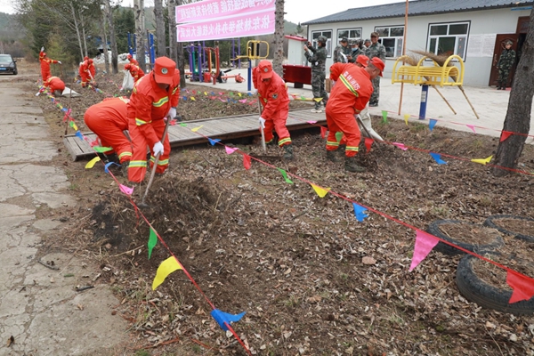 開設(shè)防火隔離帶,是阻擋火源的有效方法。依東林場將環(huán)境衛(wèi)生整治與防火科目結(jié)合起來,在門前擺下擂臺,拉出橫線設(shè)立分區(qū),六組隊員進入場地爭分奪秒、互不相讓,有的耙、有的裝,一會功夫一條干凈、規(guī)范的“隔離帶”出現(xiàn)在眼前。