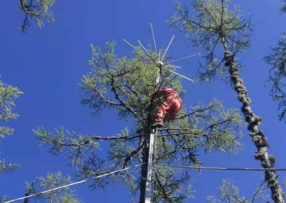 呼中林業(yè)局工作人員依附樹木進行“拒雷”設備安裝(徐志偉攝)