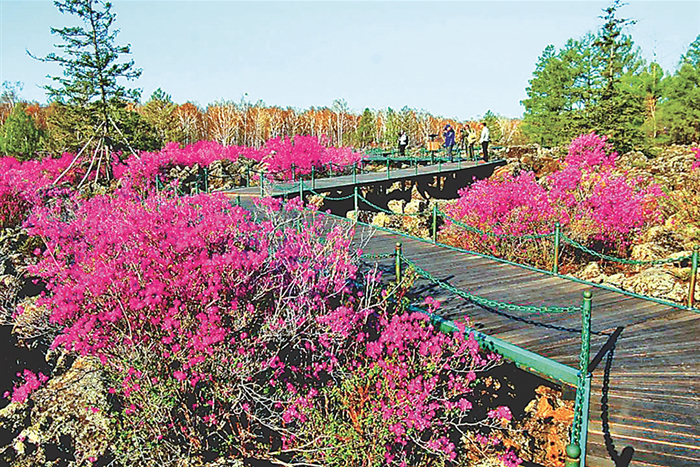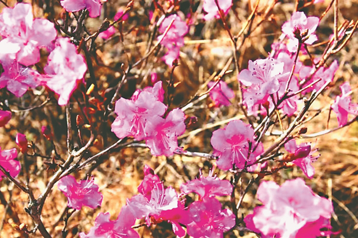 興安杜鵑有很多動聽的名字,達子香、滿山紅、映山紅等,朝鮮族叫它“金達萊”,野生興安杜鵑被列為國家重點保護二級野生植物。一簇簇,一片片,艷如桃李、燦若云霞、熱情似火、暗香四溢,游覽采風的人們紛至沓來。