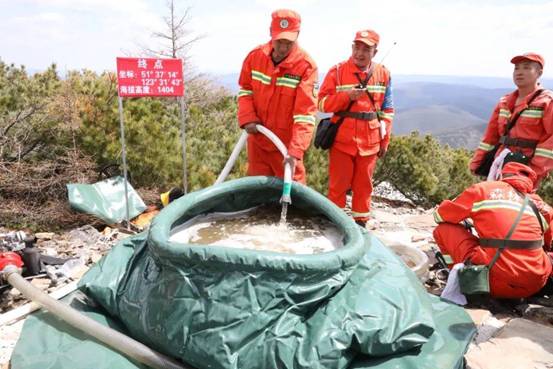 據(jù)了解,此次演練模擬小白山最高峰海拔1404米的“興安第一塔”附近偃松林發(fā)生火情,在海拔886米尋找到一處水源地,撲火隊員利用高揚程山地引水泵向1150米處放置的儲水囊供水,同時架設(shè)第二臺水泵向山頂供水,兩臺水泵交叉接力成功將水引向小白山最高峰,噴淋“興安第一塔”,整個過程鋪設(shè)水帶全長3740延長米,垂直爬高519米。