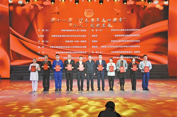 市領(lǐng)導(dǎo)郭廣福、呂瑞晏、肖爽、田寧和各界青年代表觀看了演出,并分別為第十一屆“伊春青年五四獎?wù)隆薄?022年伊春市“向上向善好青年”、2021年度全市“兩紅兩優(yōu)”獲獎代表頒獎。