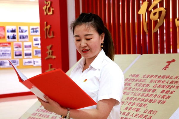 阿木爾林業(yè)局管理服務中心黨員杜淼在朗誦詩歌《七月的天空》(王力 攝)