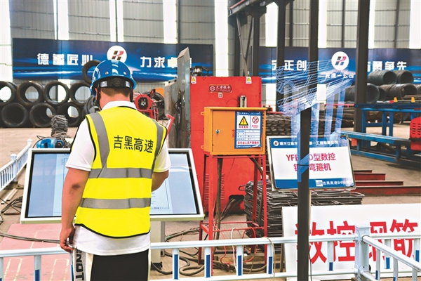 鋼筋加工車間里一處3D立體投影,讓工人們可以直觀看到自己加工后的構件將用于整體鋼筋骨架的哪個部位。任書法說,吉黑高速項目打造智慧梁廠,采用了數(shù)控鋼筋滾焊機、數(shù)控鋼筋剪切生產(chǎn)線、數(shù)控鋼筋彎曲中心+自動上料配套等設備,以前這么大的加工廠要30多人,現(xiàn)在只需一半的人力,就能干出兩倍的工作量,極大提高了施工精度和效率。