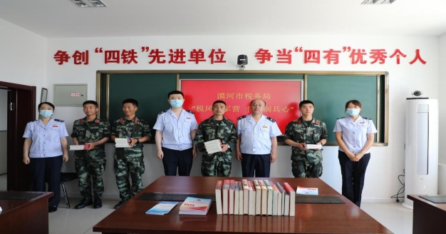 稅務(wù)干部向部隊(duì)官兵贈(zèng)送書(shū)籍。