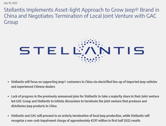 7月18日,Stellantis集團(tuán)發(fā)布公告稱,正在與廣汽集團(tuán)協(xié)商終止合資公司廣菲克的經(jīng)營,并將有序停止Jeep品牌的國產(chǎn)化;未來,Stellantis將通過進(jìn)口的方式獨(dú)自在中國銷售、經(jīng)營Jeep產(chǎn)品。