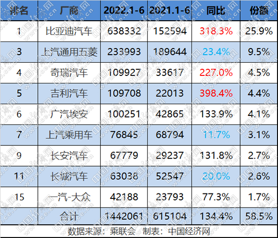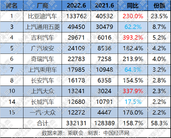 在乘聯會發(fā)布的6月新能源乘用車批發(fā)銷量廠商排名(TOP15)中,傳統(tǒng)品牌占據10席,共計銷售33.2萬輛,同比增長158.7%,市場份額接近六成,達到58.3%,1-6月,傳統(tǒng)品牌新能源累計銷售144.2萬輛,同比增長134.4%,份額同樣接近六成,為58.5%。