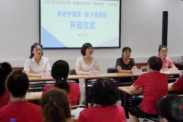 黑龍江經(jīng)濟網(wǎng)訊(王巖)為進一步培養(yǎng)養(yǎng)老護老專業(yè)人才,提升養(yǎng)老護理員隊伍職業(yè)化、專業(yè)化水平,7月26日,由中國婦女發(fā)展基金會與愛茉莉太平洋發(fā)起,哈爾濱市婦聯(lián)指導,黑龍江龍妹職業(yè)技能培訓學校承辦的“愛茉莉太平洋‘她來管家’女性賦能公益項目”養(yǎng)老護理員線下培訓班正式開班,來自各區(qū)縣社區(qū)的34名學員參加了開班儀式。