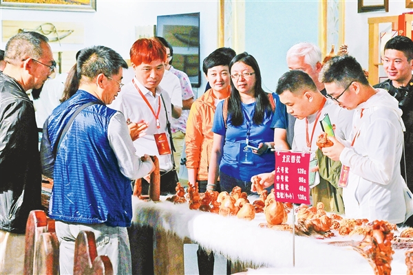 網(wǎng)絡(luò)名人在永達木藝參觀北沉香工藝品(胡錫韋/攝)。