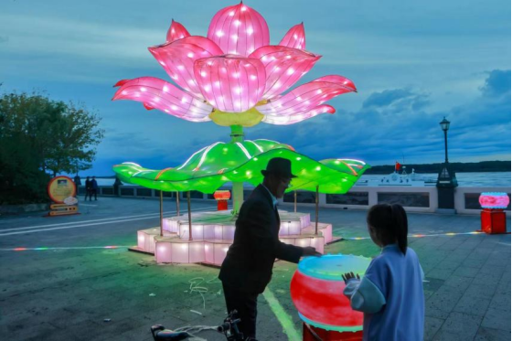 華燈初上,市民和游客紛紛“逐”光而來,圍繞在燈組旁嬉戲玩耍,拍照留念,歡聲笑語在龍鄉(xiāng)秋夜里久久回蕩。景觀燈光秀中最有設(shè)計感的應(yīng)數(shù)“盛世第一蓮”燈組了,它以嘉蔭蓮化石——中國“第一蓮”為設(shè)計靈感,以蓮喻廉,借此弘揚(yáng)廉潔文化。