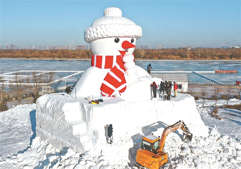 12月7日,哈爾濱市道里區(qū)群力江畔,一座巨型雪人已基本制做完成,工人在進(jìn)行收尾工作。雪人近20米高,黑眼睛,紅鼻子,戴著紅圍巾和白絨帽,手里拿著一大串糖葫蘆,笑容可掬,十分可愛。本報記者 蘇強(qiáng)攝