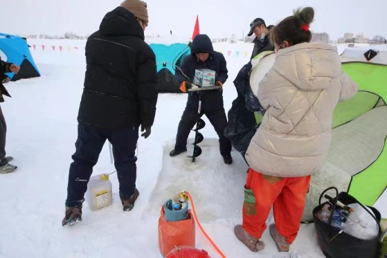 “龍行雪野”朔風(fēng)吹,游人“共釣寒江雪”。開幕式結(jié)束后,嘉蔭縣“休閑漁業(yè)”冰釣歡樂賽在嘉蔭永安東湖正式開始。平靜的冰面上,冰釣愛好者在支好的帳篷里有條不紊地生起暖爐、鑿開冰面、下好魚餌,靜等魚鉤跳動。隆冬時節(jié),冰雪蓋地、魚潛深水,冰釣愛好者以釣技論英雄,共享冰雪歡樂盛宴。