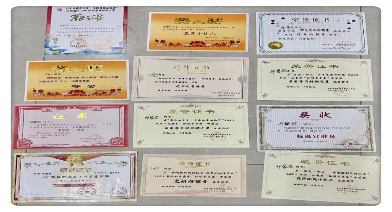 在成長過程中,面對(duì)學(xué)習(xí),她不斷挑戰(zhàn)自我,勇于創(chuàng)新,努力去探索新領(lǐng)域,收獲新知識(shí)。邱馨然不僅熱愛學(xué)習(xí),而且注重興趣的發(fā)展,先后獲得中國歌劇舞劇院頒發(fā)的全國社會(huì)藝術(shù)水平考級(jí)朗誦九級(jí),中國舞蹈家協(xié)會(huì)頒發(fā)中國舞九級(jí),中國音樂學(xué)院頒發(fā)古箏二級(jí),文化和旅游部發(fā)展中心頒發(fā)硬筆書法四級(jí),中國文化信息協(xié)會(huì)頒發(fā)“文明與藝術(shù)”少年英才藝術(shù)全國總展演獨(dú)舞一級(jí)等11個(gè)國家級(jí)獎(jiǎng)項(xiàng)和30多個(gè)省級(jí)、市級(jí)、區(qū)級(jí)、校級(jí)獎(jiǎng)項(xiàng)。