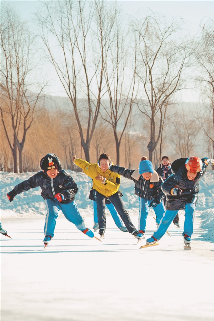 楊揚(yáng)(左二)在冰場上輔導(dǎo)孩子們滑冰。 圖片由受訪單位提供