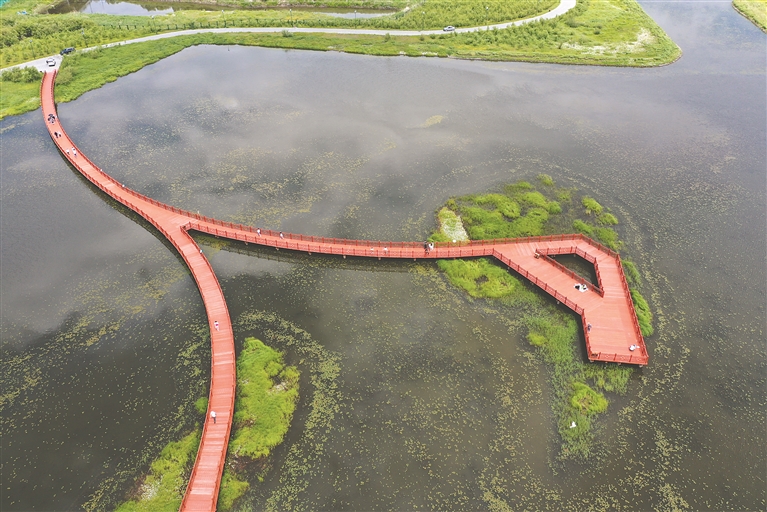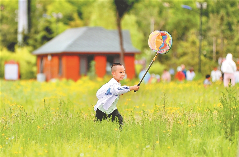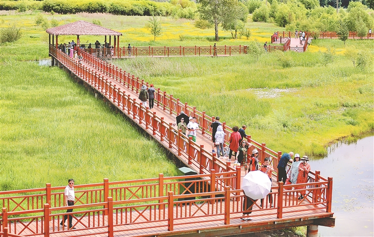 10日,哈爾濱市群力外灘濕地公園內(nèi),許多市民前來(lái)踏青游玩。持續(xù)多日的降雨,使得濕地內(nèi)的植物生長(zhǎng)得更加茂盛,綠樹如茵、芳草遍地。人們有的走上蜿蜒的棧道觀賞野生鳥類和各種水生植物,有的坐在亭臺(tái)里休憩、野餐。孩子們?cè)诓莸厣媳寂苤?、歡笑著,享受踏青帶來(lái)的快樂(lè)。
