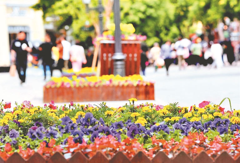 13日,哈爾濱市道里區(qū)中央大街上,行人從五彩繽紛的花卉旁走過。進(jìn)入夏季,來哈爾濱避暑游玩的游客不斷增多,為給游客打造一個(gè)舒適美麗的旅游環(huán)境,中央大街上種植了三色堇、金魚草、矮牽牛、四季海棠等多種花卉。這些鮮花姹紫嫣紅、爭(zhēng)奇斗艷,將整條街道裝點(diǎn)得十分靚麗。