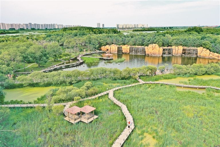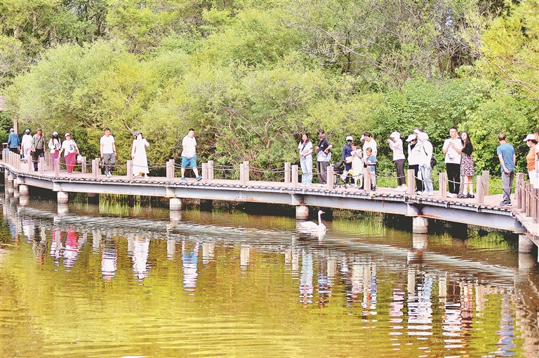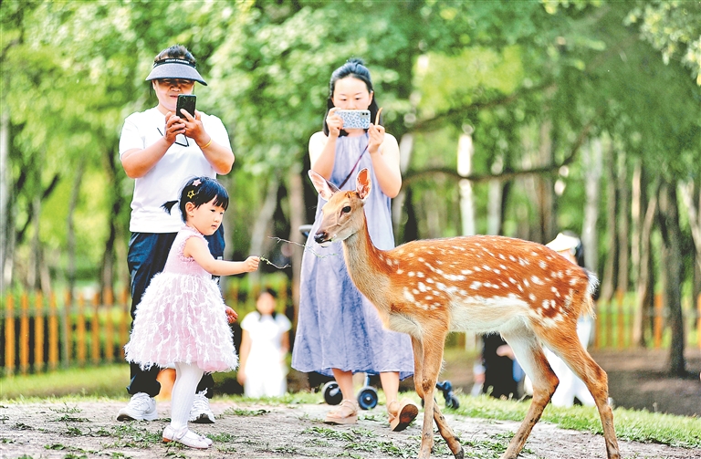 16日,陽(yáng)光明媚,空氣清新,哈爾濱市迎來了好天氣。太陽(yáng)島上,草木茂盛,百花爭(zhēng)艷,許多本地市民和南方游客組團(tuán)來到這里避暑游玩。有的游人搭起帳篷野餐,有的游人走上濕地棧道觀賞美麗風(fēng)景。孩子們玩過各種游樂項(xiàng)目后,再與小鹿、松鼠等小動(dòng)物來個(gè)親密接觸。