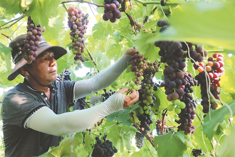 “春棚栽培的葡萄在8月中旬成熟,而在暖棚里,由于溫度、濕度得到科學(xué)精準控制,葡萄成熟得更早,產(chǎn)量更高。7月10日左右即可上市,搶占市場空缺?!笔卟斯矩撠熑送踯姀娺呎f一邊拿起手機拍攝,為一周后葡萄上市進行宣傳。