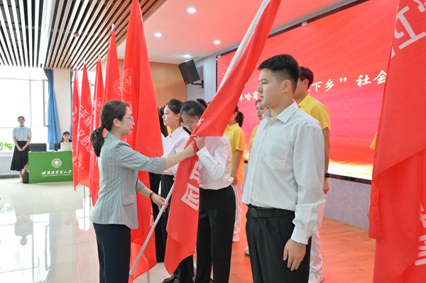 省希望工程捐助中心主任、省青少年發(fā)展基金會理事長杜晶為哈爾濱商業(yè)大學(xué)2024年“三下鄉(xiāng)”社會實踐團隊代表、“情暖童心·鄉(xiāng)伴童行”支教團代表授旗,希望即將奔赴龍江大地的志愿者們能夠充分利用服務(wù)期,向下扎根、向上生長,踐行志愿服務(wù)精神,在奉獻與收獲中積累報國為民的樸素情懷,做有理想、有擔(dān)當?shù)男聲r代青年。