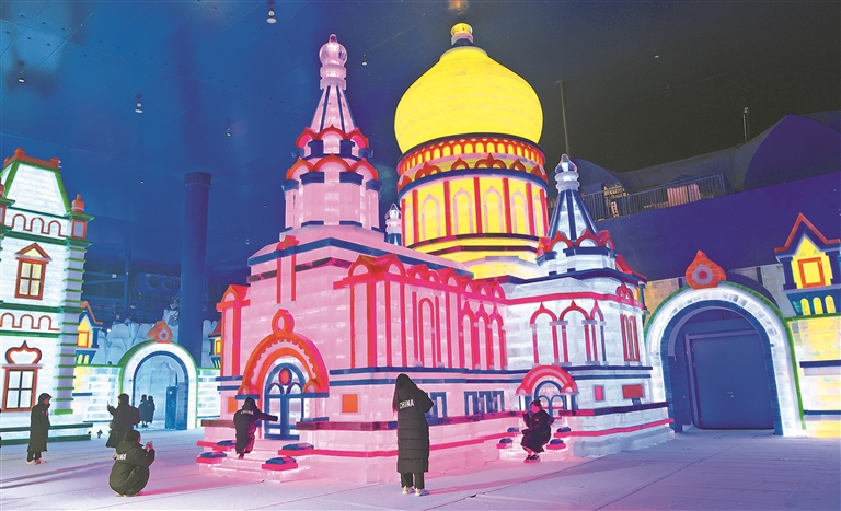游客在伏天里走進哈爾濱冰雪大世界夢幻冰雪館,穿著厚厚的外套,打卡一座座美輪美奐的冰雕雪塑,體驗-12℃的浪漫。據工作人員介紹,自夢幻冰雪館開館以來,前來參觀的游客眾多,換衣處一直處于排隊狀態(tài),人數最多時要排出近百米。