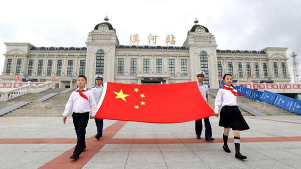 升旗儀式結(jié)束后,少先隊(duì)員現(xiàn)場(chǎng)對(duì)《紅領(lǐng)巾愛(ài)祖國(guó)——我心中的五星紅旗》長(zhǎng)卷手繪涂色,將自己心中最美的顏色送給祖國(guó)。在北極鎮(zhèn)七星廣場(chǎng)同步開(kāi)展了快閃活動(dòng),少先隊(duì)員、合唱團(tuán)和現(xiàn)場(chǎng)群眾共同演唱了《歌唱祖國(guó)》《身在最北方 心向黨中央》等歌曲。
