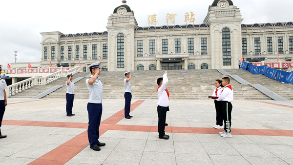 在國(guó)旗下,漠河市邊境檢查站代表陳澤和“全區(qū)十佳駐村干部”王成龍用自己生動(dòng)的故事為在場(chǎng)的每位少先隊(duì)員們上了一堂生動(dòng)的國(guó)防教育課,漠河市的少先隊(duì)員代表王涵在國(guó)旗下表達(dá)了對(duì)祖國(guó)的熱愛(ài)和對(duì)戍邊工作者們的敬佩。團(tuán)省委副書(shū)記陳海萍在講話中鼓勵(lì)少先隊(duì)員要學(xué)習(xí)漠河戍邊工作者們的堅(jiān)韌不拔和無(wú)私奉獻(xiàn),要立足祖國(guó)最北方志存高遠(yuǎn)、勤奮學(xué)習(xí)、錘煉品德、強(qiáng)健體魄,敢于創(chuàng)新、富于創(chuàng)意、樂(lè)于創(chuàng)造,要沿著“入隊(duì)、入團(tuán)、入黨”的“人生三部曲”奮力前進(jìn),為推進(jìn)中國(guó)式現(xiàn)代化、實(shí)現(xiàn)強(qiáng)國(guó)復(fù)興偉業(yè)貢獻(xiàn)青春力量。