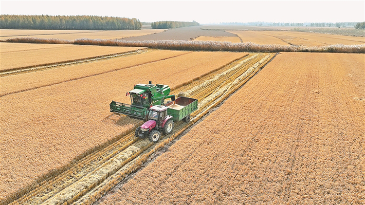 秋風送爽,東極大地盡是豐收美景。稻田里,金黃色的波浪翻滾,預(yù)示著又一個糧食滿倉的好年景。