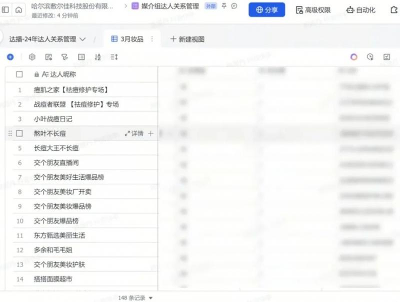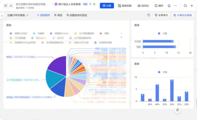 由于器械字號(hào)產(chǎn)品的特殊性,現(xiàn)在敷爾佳通過飛書在線文檔審批達(dá)人,將達(dá)人數(shù)據(jù)填寫上報(bào),上級(jí)在線同步審批達(dá)人,跟進(jìn)確定合作。直播中,用飛書云盤儲(chǔ)存資料,將達(dá)播錄屏,產(chǎn)品資料等數(shù)據(jù),同步云盤,方便各部門查看,調(diào)取相關(guān)資料。直播后,利用飛書多維表格將達(dá)人信息,合作傭金,產(chǎn)出 GMV,對接人等重要信息歸攏一起,形成多維表格方便組織內(nèi)互相查閱填寫, 通過儀表盤的功能體現(xiàn)出哪些達(dá)人是優(yōu)質(zhì)合作達(dá)人,并為二次投放合作提供了參考價(jià)值。