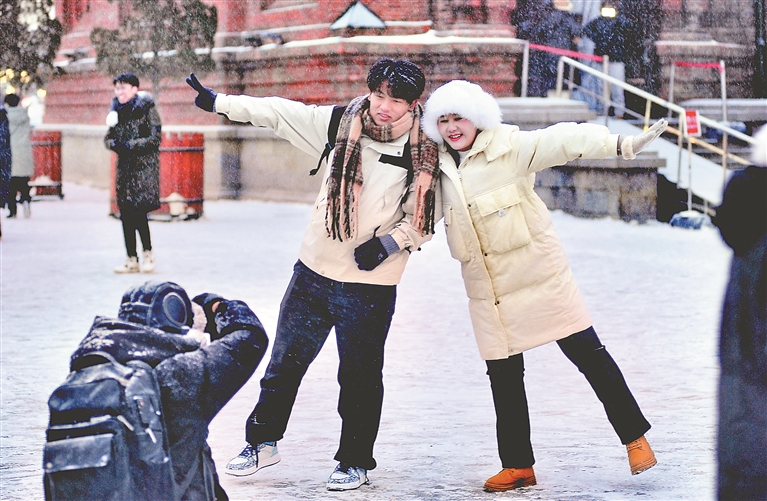 在各處景點(diǎn),降雪讓游客們游玩興致更濃,大家紛紛在雪中拍照,記錄下精彩瞬間,感受降雪帶來(lái)的快樂(lè)。
