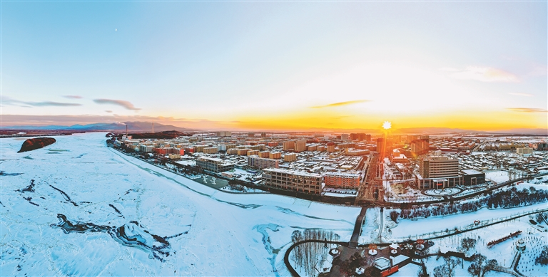 從饒河縣沿江公園俯瞰,烏蘇里江如同一條白色巨龍,靜止的江面盡展千里冰封的北國風(fēng)光,江面上隆起的座座冰丘高低起伏、連綿不斷,在冬日夕陽的照耀下,映射出耀眼的光芒。