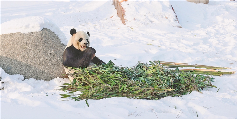 尤其是“佑佑”,曬著午后暖陽(yáng),坐在室外的雪地里,大口“狂炫”竹葉,這一口吃夠了,就尋覓著從雪里刨出來(lái)一根竹筍,秒變“剝筍小哥”?!坝佑印边€時(shí)不時(shí)停下來(lái),盯著人群定格幾秒,仿佛是專門為游客拍照擺好姿勢(shì),令不少南方小伙伴感嘆“開(kāi)了眼界”。