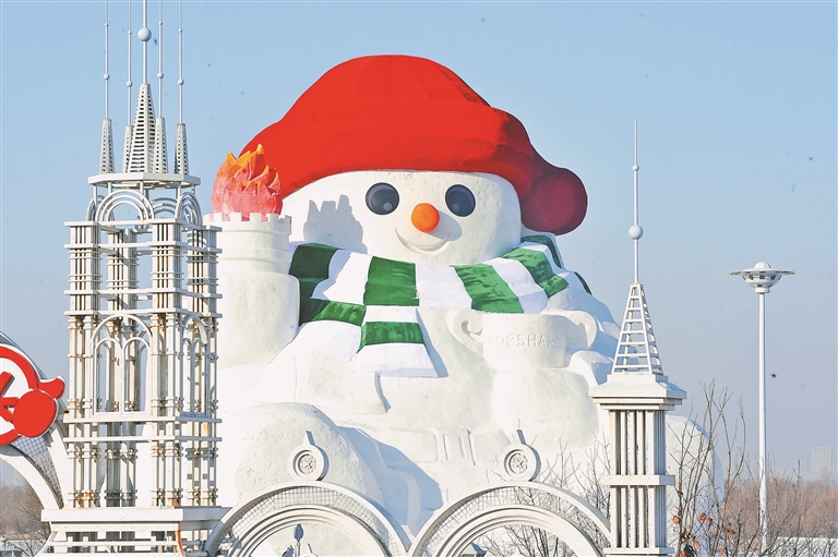 近日,哈爾濱市道里區(qū)群力江畔雪人碼頭,23米高的大雪人主體已經(jīng)完成,工人正在進(jìn)行收尾工作。這座大雪人頭戴紅帽子,圍著白綠相間的圍脖,手里舉著火炬,十分可愛,吸引了許多游客和市民前來觀看。