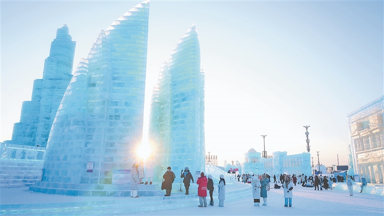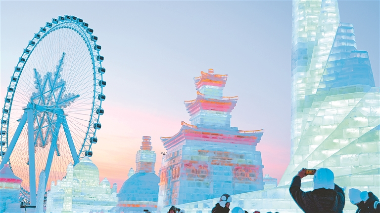 哈爾濱冰雪大世界將亞奧理事會(huì)成員的地標(biāo)景觀以冰雪形式呈現(xiàn),獨(dú)具匠心的冰雕建筑讓游客足不出園游亞洲。本報(bào)記者 劉心楊攝