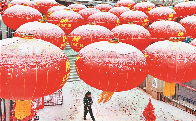 7日,臘八節(jié),哈爾濱市迎來降雪天氣。在白雪映襯下,街邊和廣場(chǎng)上懸掛的大紅燈籠更顯喜慶。街上的行人紛紛拿出手機(jī)拍下精彩瞬間。在一些市場(chǎng)內(nèi),銷售臘八粥、臘八蒜的攤位擠滿了消費(fèi)者,生意十分紅火。