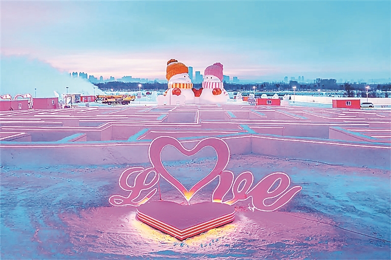 日前,坐落于哈爾濱大劇院西南江面的“爾濱之心歡樂島”開園。這是一座以“愛”為名設(shè)計(jì)建造的冰雪主題樂園,總面積約60萬平方米,共有56處心形景觀,還有“冰封玫瑰”和大雪人,“島”內(nèi)愛意滿滿,吸引了不少游客前來打卡拍照。