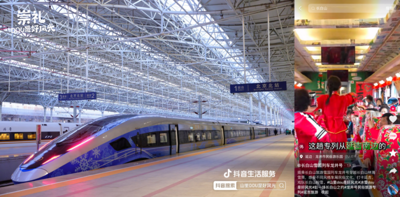 在線下,活動(dòng)還聯(lián)動(dòng)崇禮區(qū)政府、延邊州商務(wù)局、齊齊哈爾網(wǎng)信辦落地雪國(guó)專列,覆蓋復(fù)興號(hào)、民俗專列、高鐵站等不同場(chǎng)景,讓游客和市民感受濃濃冰雪氛圍,自發(fā)為當(dāng)?shù)匚穆梅N草,吸引更多雪友來(lái)到小城看見(jiàn)好風(fēng)光。截至活動(dòng)收官,“開(kāi)往崇禮站的雪國(guó)專列”熱度達(dá)827萬(wàn),一度登上抖音河北多地同城榜TOP1。