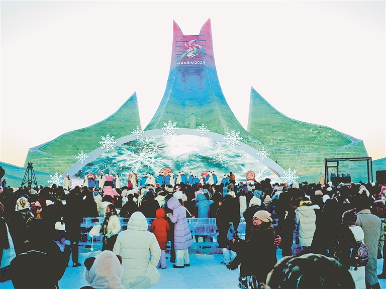 精美與靈動(dòng)相互交織,園區(qū)內(nèi)亞冬會(huì)氛圍濃厚?!拔覀冊趫@區(qū)內(nèi)看到很多亞冬會(huì)元素的冰雪景觀,像雪雕‘濱濱’‘妮妮’、會(huì)徽大地景觀等,準(zhǔn)備逐個(gè)打卡?!鄙綎|游客許多開心地說。