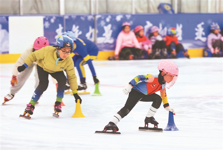 2日,哈爾濱市道里區(qū)冰上運(yùn)動中心氣膜冰場內(nèi),百余名中小學(xué)生正在練習(xí)滑冰。