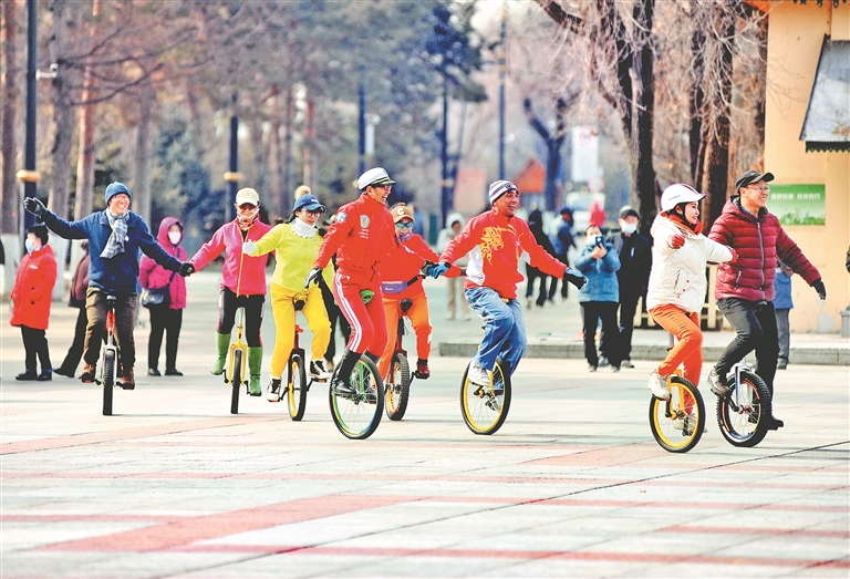 在哈爾濱市江畔斯大林公園內(nèi)的小廣場(chǎng)上,許多人在練習(xí)騎獨(dú)輪車。在樹(shù)林旁,數(shù)十位老年人在跳民族舞。公園的人行道上,不時(shí)有成群的徒步者走過(guò)。