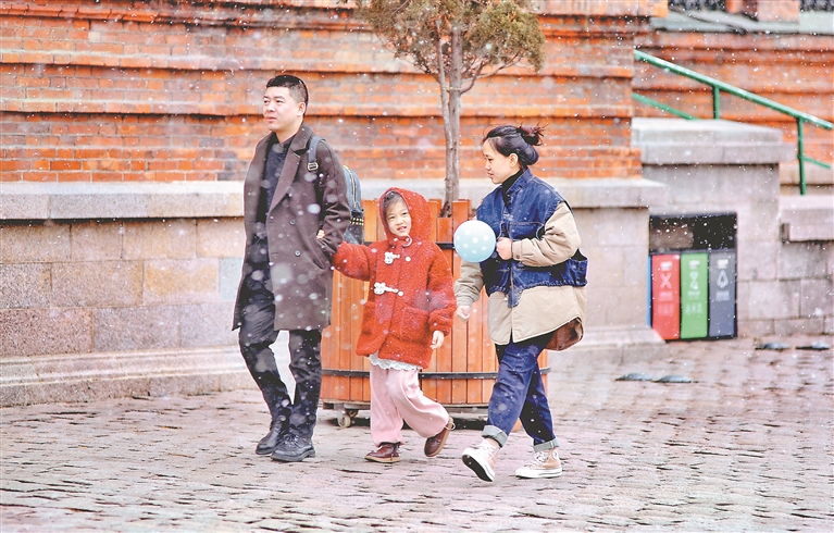 哈爾濱市的雪花落地后融化成水,未對(duì)道路交通造成影響。人們紛紛拿出手機(jī)拍攝精彩瞬間。