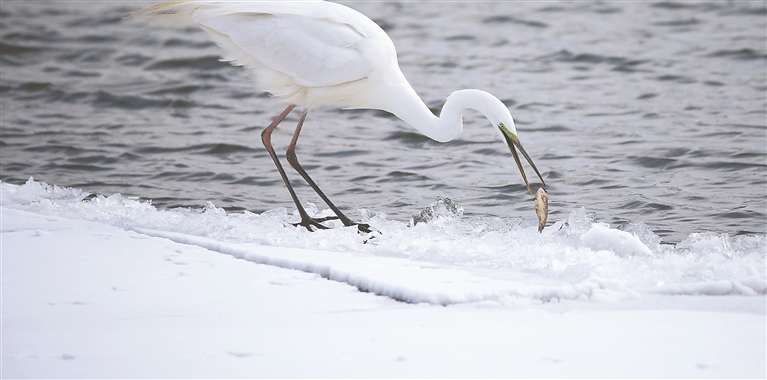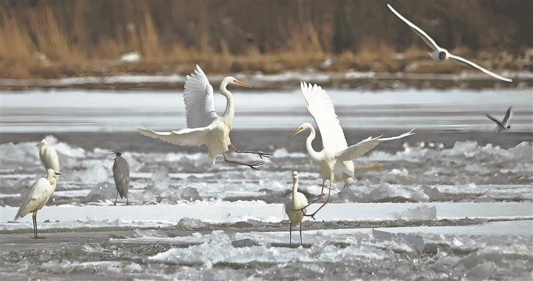 冰排流動(dòng),數(shù)百只鷺鳥(niǎo)羽翅翻飛,鳴聲陣陣,此時(shí)的松花江一派生機(jī)勃勃的景象。