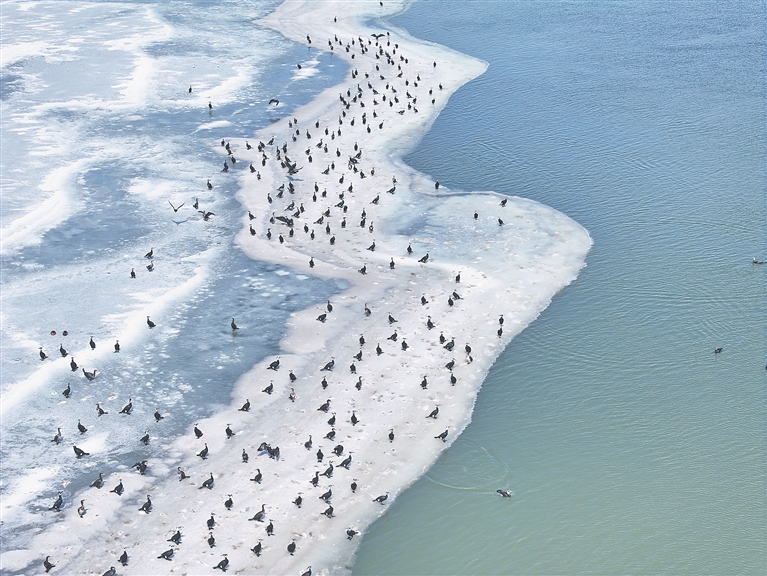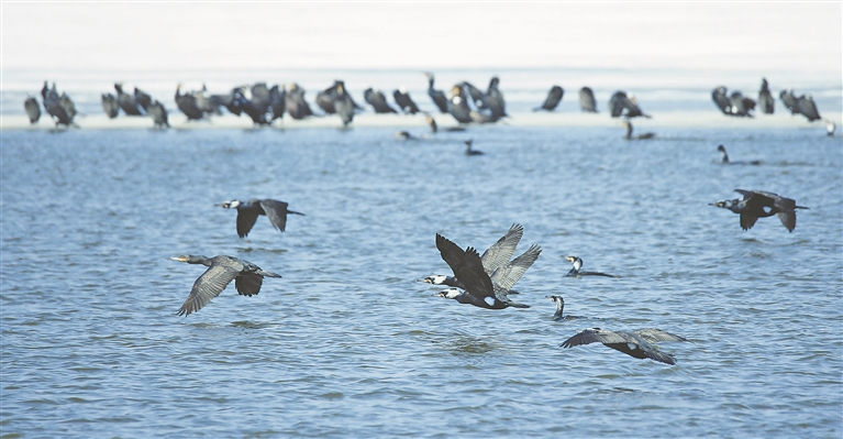 近日,松花江哈爾濱段出現大群的鸕鶿,它們在冰融的松花江上聚在一起,觀察著江面魚類的蹤跡,一旦發(fā)現魚群,近千只鸕鶿就快速游過去,潛水捕起“開江魚”。