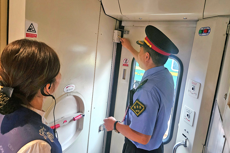列車長在對(duì)車門加鎖情況進(jìn)行檢查。(韓峰 攝)
