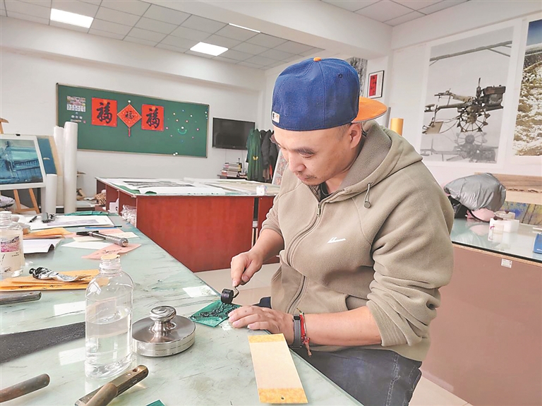 “刻刀不僅要留住祖輩的手溫,更要刻出時(shí)代的呼吸。”在慶安縣美術(shù)館(版畫院)創(chuàng)作室內(nèi),慶安版畫第五代傳承人吳蔚握著刻刀,在木板上勾勒出蓬松的雪紋。隨著刻刀起落,一片“雪原”逐漸成形——這既是慶安版畫對東北冰雪文化的生動(dòng)詮釋,也是非遺技藝緊跟時(shí)代潮流的縮影。