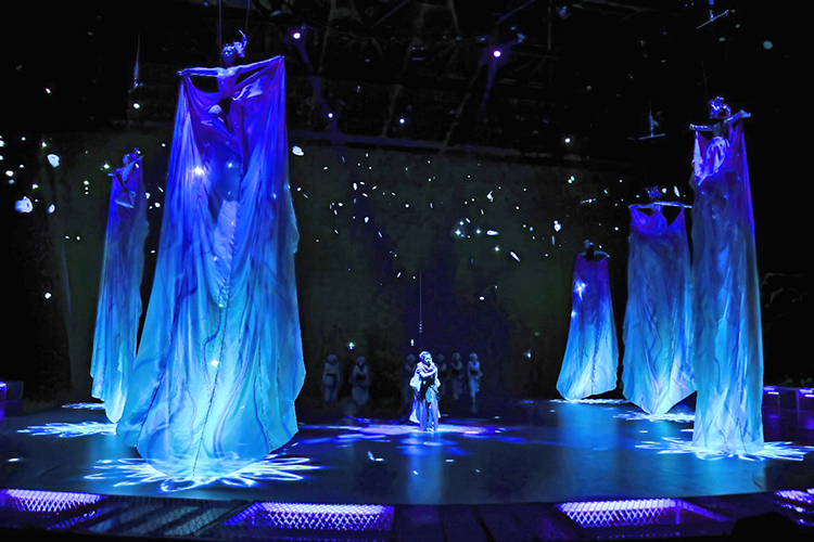 全新的演出以游戲玩家視角展開(kāi),當(dāng)游戲開(kāi)始,巨大的環(huán)形地幕瞬間點(diǎn)亮,蒼茫的北境雪原鋪展開(kāi)來(lái),激光投影在穹頂交織出流動(dòng)的光幕,與升騰的煙霧交融,千年前的部落場(chǎng)景躍然眼前。
