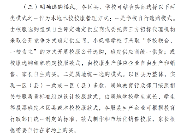 新規(guī)設(shè)計的“自行選購模式”靈活且務(wù)實:規(guī)模較大的學??勺灾髟u定供應(yīng)商或委托第三方招標;小規(guī)模學校可采取“多校聯(lián)合、一校為主”的方式降低采購成本;甚至允許“確定款式后,由企業(yè)市場化生產(chǎn)銷售,家長自主購買”。新規(guī)嚴禁“定點”“定商標”干涉交易,不得設(shè)置不合理入圍條件,確保所有合規(guī)企業(yè)都能公平參與競爭。