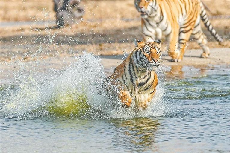 為提高游客觀賞體驗,園區(qū)通過工作車、無人機等多種方式,引導東北虎進行水中捕食等,激發(fā)東北虎的野性與活力的同時,為游客呈現(xiàn)一場真實、震撼的視覺盛宴。