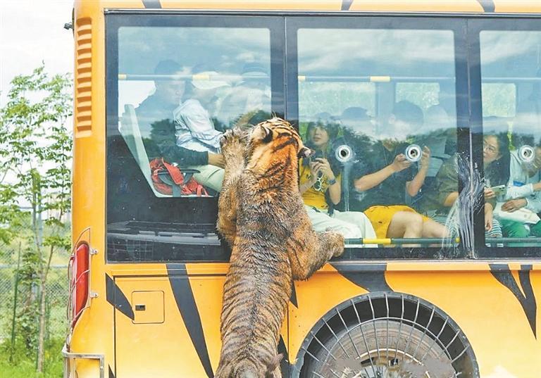 在驚險觀光車上,游客可以通過特制裝置給成年虎投喂食物,體驗“虎口投食”的刺激。“從來沒想過能這么近距離接觸東北虎,看著它從我手中的夾子吃肉,既緊張又激動!”來自上海的大學生語氣難掩興奮。