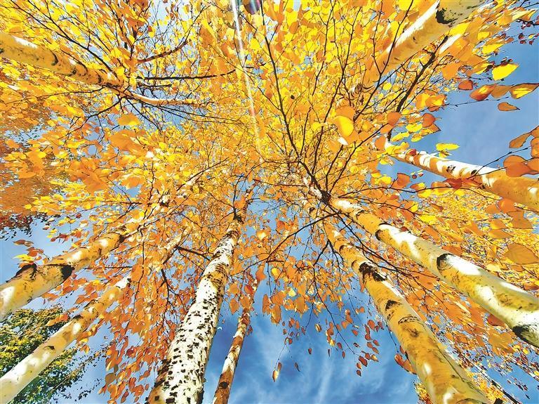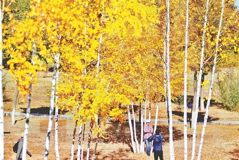 12日,哈爾濱市道里區(qū)麗江路附近的松花江畔,一小片白樺林吸引人們駐足觀賞、拍照。深秋的白樺樹,樹干筆直高聳,樹皮潔白如紙。枝頭的葉子已經(jīng)由綠色變成了金黃色,在陽光的照耀下,色彩濃重,景色迷人。本報(bào)記者 蘇強(qiáng)攝