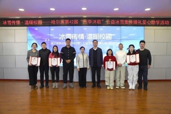 此次哈爾濱第42屆“四季沐歌”公益冰雪集體婚禮愛心助學行動創(chuàng)新性地將浪漫婚禮與公益助學相結(jié)合,讓新人們在收獲幸福的同時也成為公益的傳播者,用愛心架起校園與社會的橋梁,為這座浪漫冰城增添了溫暖底色。參與活動的新人代表表示:“能在這座城市許下一生誓言,又能在人生重要時刻為孩子們做點實事,感覺特別有意義?!?助學儀式現(xiàn)場,共青團哈爾濱市委常委、哈爾濱青年宮書記、主任李晨與四季沐歌集團公益慈善委員會主席吳典華為新人代表頒發(fā)捐贈榮譽證書。